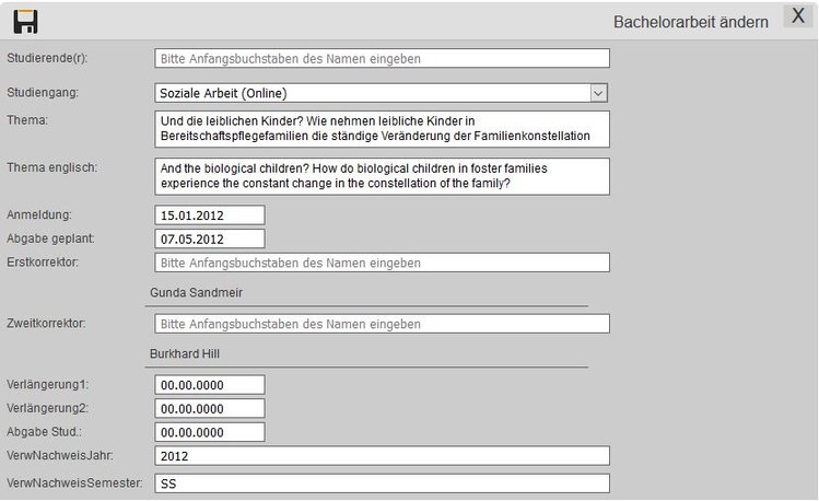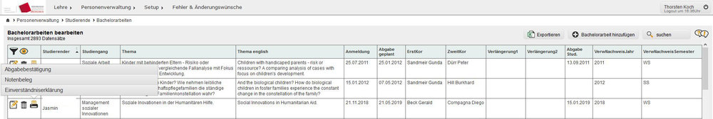 Im Menüpunkt "Bachelorarbeiten" erhalten Sie eine Übersicht über die derzeit angelegten Bachelorarbeiten in der FK11 und die Möglichkeit diese zu ändern oder neue hinuzufügen.
