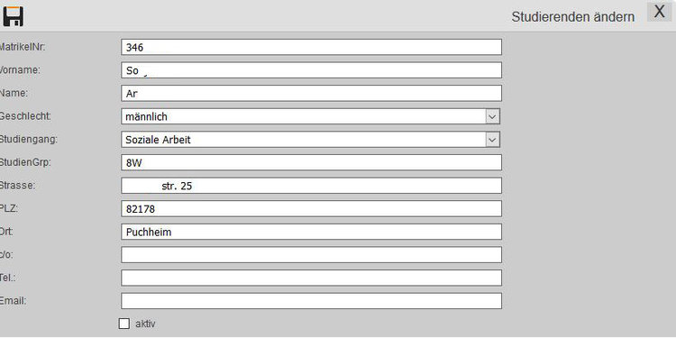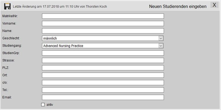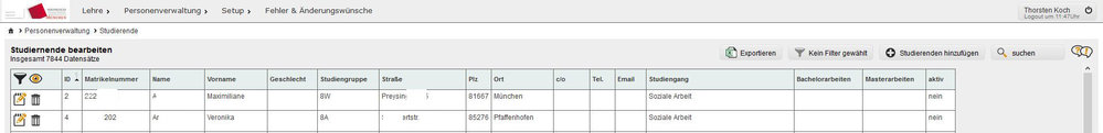 Im Menüpunkt "Studiernde" erhalten Sie eine Übersicht über die derzeit angelegten Studiernde ind er FK11 und die Möglichkeit diese zu ändern oder neue hinuzufügen.